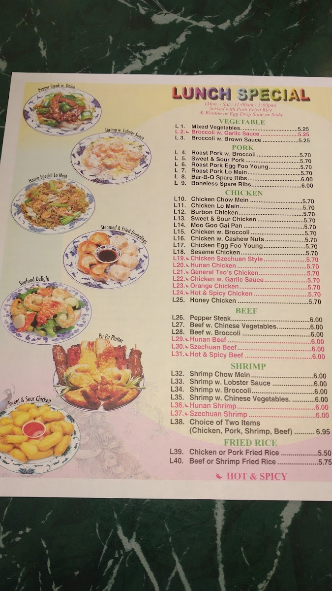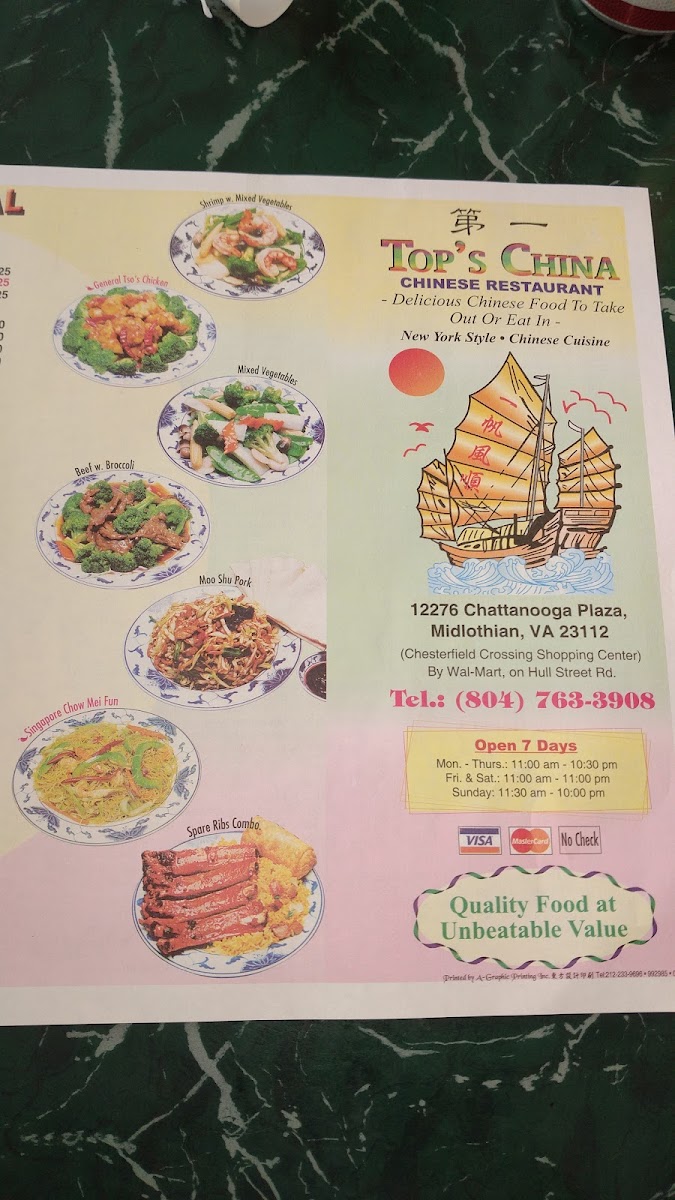 Top's China in Midlothian offers a diverse menu filled with flavorful options for every taste. Their Special Combination Plates include dishes like C19. Szechuan Beef Or Shrimp and C22. General Tso's Chicken, perfect for those craving bold flavors. For lighter options, their Lunch Special - Vegetable features selections such as L1. Mixed Vegetables and L3. Broccoli with Brown Sauce. The Lo Mein section offers favorites like 51. Beef Lo Mein and 53. Lobster Lo Mein, while the Appetizers include crispy treats like 5. Dumplings (8) and 2. Spring Roll (Each). For soup lovers, there’s the comforting 21. House Special Soup or 19. Egg Drop Soup. The Special Dishes section is filled with tempting options such as Fried Shrimp (15) and Chicken Wings (4). In the Pork category, you can enjoy dishes like 69. Roast Pork With Garlic Sauce (Large) or 65. Roast Pork With Snow Peas. Chicken options include favorites like 87. Chicken With Snow Peas and 88. Kung Pao Chicken. Seafood lovers will find delights like 109. Shrimp With Mixed Vegetables or 106. Shrimp With Garlic Sauce. For a satisfying side, try Fried Rice options such as 43. Sausage Fried Rice or 44. House Special Fried Rice. The Healthy Eatings section offers lighter dishes like H5. Steamed Shrimp With Mixed Vegetables. With so many choices, Top's China delivers both variety and quality for an enjoyable dining experience.